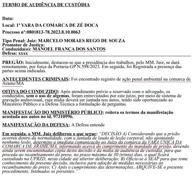 Segundo os autos, no dia 03 de agosto, três meses após a tramitação da ação de reintegração de posse, “Mano” foi conduzido, sem o uso de algemas, para audiência de custódia com o juiz da 1ª Vara da Comarca de Zé Doca, Marcelo Moraes Rego de Souza, onde foi informado acerca do cumprimento do mandado de prisão. Em seguida, ele acabou detido e custodiado na Unidade Prisional de Zé Doca (UPRZD), onde aguardou ulterior deliberação.