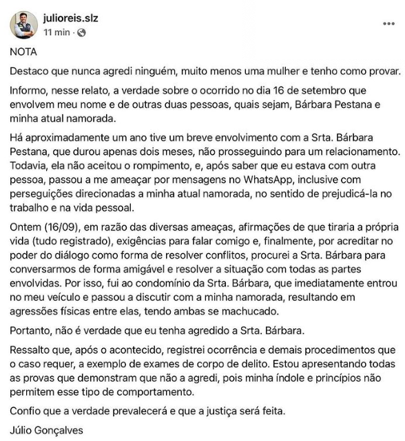 Nas redes sociais, Júlio contou sua versão sobre o episódio, negando que tenha agredido Bárbara, mas admitiu que houve um desentendimento entre ela e sua atual namorada. Veja abaixo.