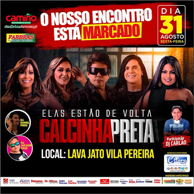 A banda Calcinha Preta se apresentará no dia 31 de Agosto, na Lava Jato Vila Pereira/Rosário-MA. Com mais de 20 anos de carreira, o grupo trará em seu repertório sucessos como “Parece Mágica”, “Você Não Vale Nada”, “Declaração de Amor” e “Louca Por Ti”.