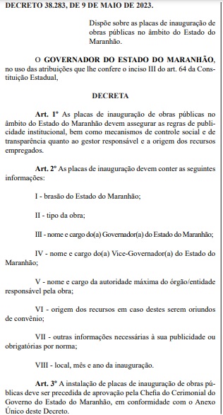 Em maio deste ano, o governador publicou o Decreto nº 38.283, que dispõe sobre as placas de inauguração de obras públicas no âmbito do Estado do Maranhão. A norma visa assegurar as regras de publicidade institucional, bem como mecanismos de controle social e de transparência quanto ao gestor responsável e a origem dos recursos empregados.
