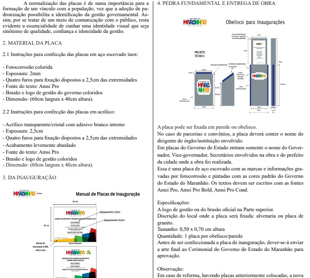 No artigo Art. 2º do dispositivo, por exemplo, destaca que as placas de inauguração devem conter as seguintes informações: I – brasão do Estado do Maranhão; II – tipo da obra; III – nome e cargo do(a) Governador (a)do Estado do Maranhão; IV – nome e cargo do(a) Vice-Governador (a) do Estado do Maranhão; V – nome e cargo da autoridade máxima do órgão/entidade responsável pela obra; VI – origem dos recursos em caso destes serem oriundos de convênio; VII – outras informações necessárias à sua publicidade ou obrigatórias por norma; e VIII – local, mês e ano da inauguração.