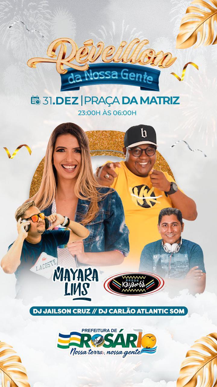 A programação começa às 23h com apresentações dos DJs Jailson Cruz e Carlão da Atlantic Som; e em seguida sobe ao palco com muito Axé e ritmos do Carnaval 2024 a Banda Kaimmbá; e para fechar o maior Reveillon da história de Rosário, se apresenta a Cantora Mayara Lins, encerrando o evento.