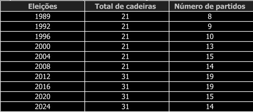 No período de exceção, no entanto, funcionavam apenas a Arena e o MDB. Após o bipartidarismo imposto pelo Regime Militar, entre 1969 e 1988, a segunda maior fragmentação registrada foi entre as eleições de 1992 e 1996, com 9 e 10 partidos, respectivamente, com representação no Legislativo da capital.