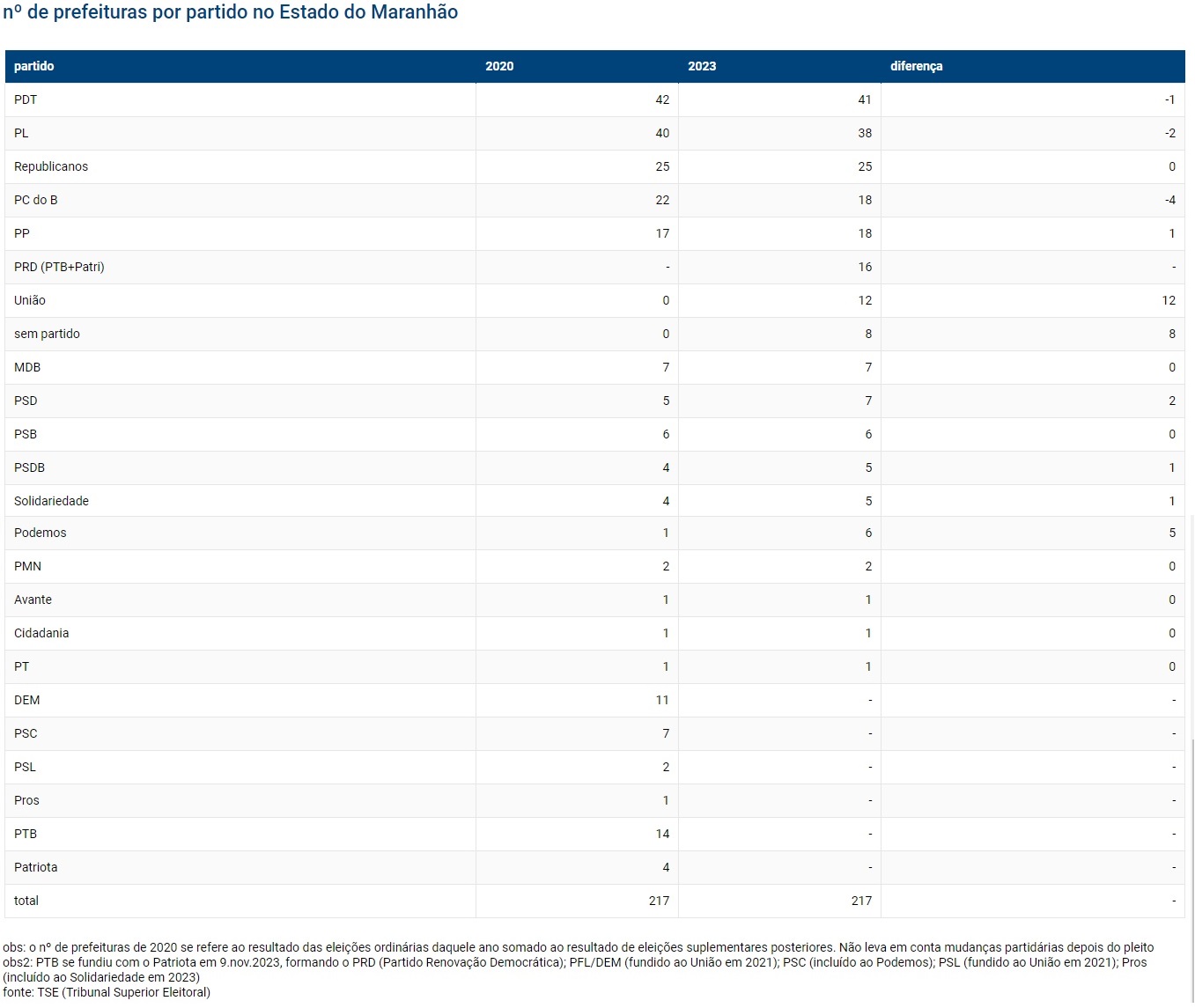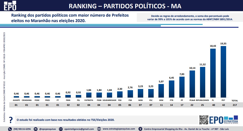 O estudo produzido pela EPO foi feito com informações do TSE (Tribunal Superior Eleitoral). Dos 217 municípios maranhenses, consta na base de dados da Corte Eleitoral, 08 prefeitos classificados como “sem partido”.