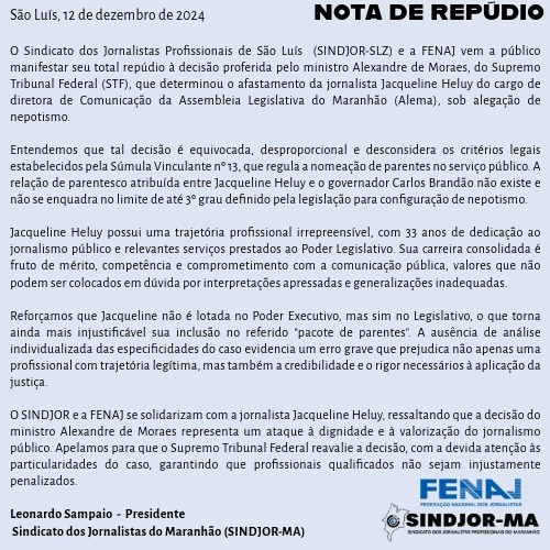 A Federação Nacional dos Jornalistas (Fenaj) e o Sindicato dos Jornalistas do Maranhão (Sindjor-MA) emitiram nesta quinta-feira, 12, notas de repúdio e solidariedade à jornalista Jacqueline Heluy, afastada do cargo de diretora de Comunicação da Assembleia Legislativa por decisão do ministro Alexandr de Moraes, do Supremo Tribunal Federal (STF).