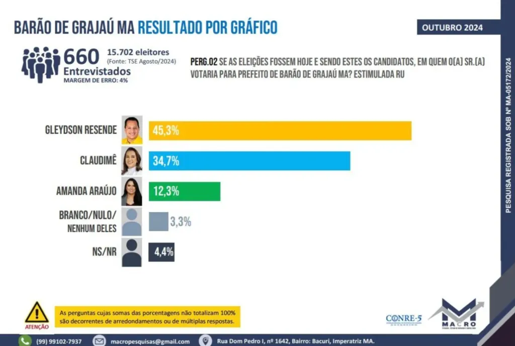 Pesquisa realizada pelo Instituto Macro de Pesquisa, contratada pelo Sistema Rio Parnaíba de Comunicação LTDA e registrada na Justiça Eleitoral sob o número MA-05172/2024, revela que o ex-prefeito Gleydson Resende (União Brasil) é o favorito para retornar à prefeitura de Barão de Grajaú em 2025. O levantamento, que ouviu 660 eleitores no município, mostra uma clara vantagem de Gleydson tanto no cenário espontâneo quanto no estimulado.