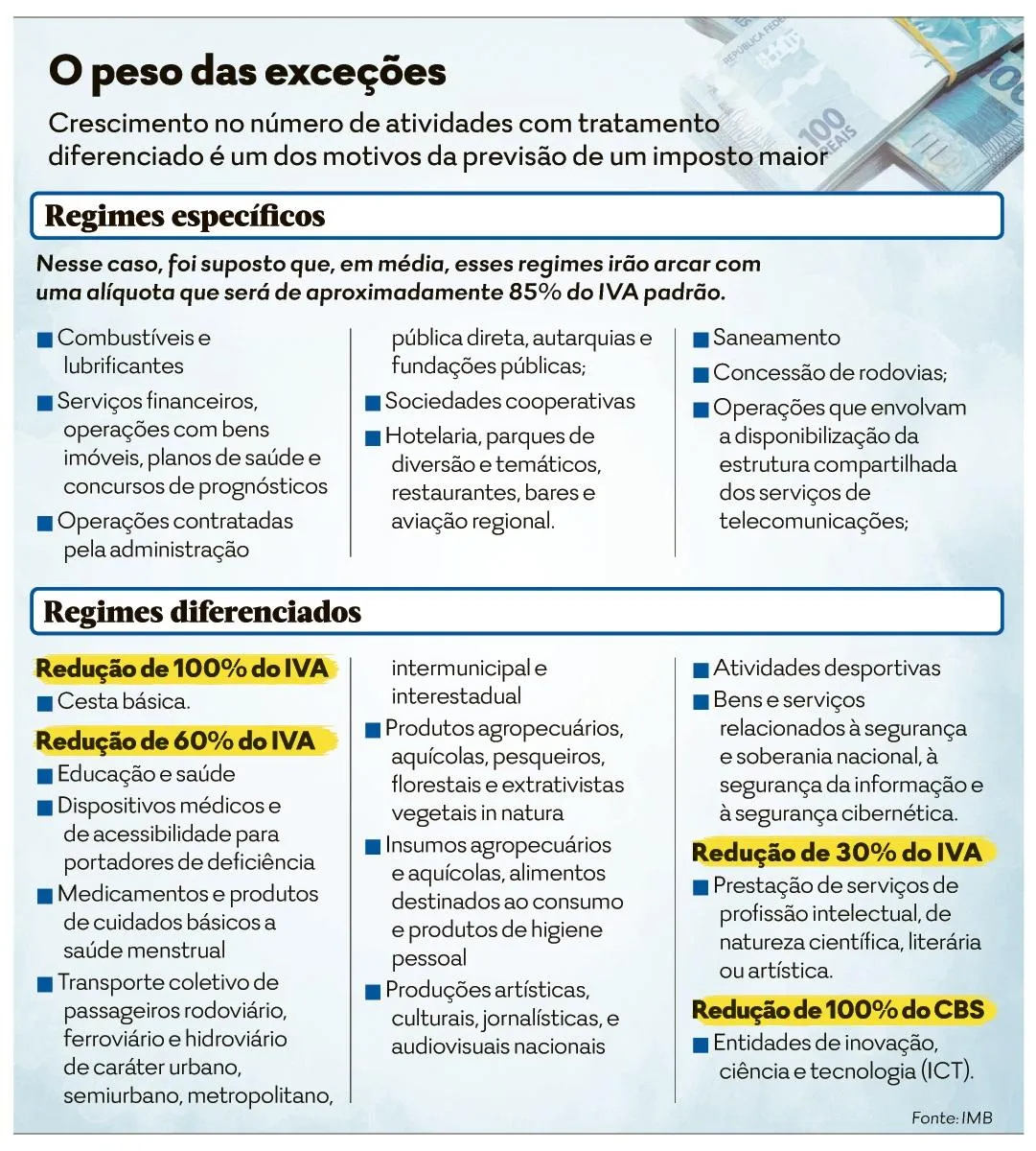 O IMB destaca que o Senado introduziu diversas exceções no texto da reforma tributária, estabelecendo impostos mais baixos para diversas categorias de profissionais, produtos e serviços, como profissionais liberais, produtos da cesta básica e combustíveis. Todas essas exceções influenciam na alíquota. Com as exceções, para manter o mesmo nível de arrecadação, no conceito de alíquota neutra, os demais setores precisarão contribuir mais para compensar essas perdas.