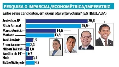 Pesquisa Econométrica contratada pelo jornal O Imparcial para medir o cenário eleitoral em Imperatriz, aponta a liderança do deputado federal Josivaldo JP, no segundo maior colégio eleitoral do Maranhão. Ele é seguido de perto pelo deputado Rildo Amaral(PP), em situação de empate técnico considerando a margem de erro.