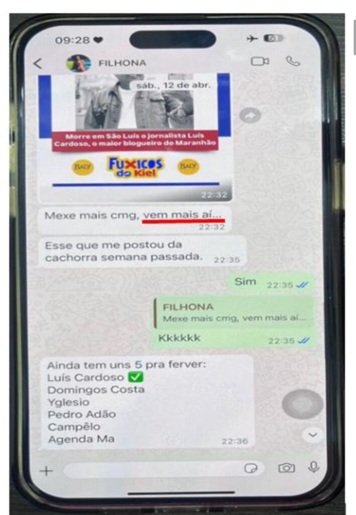 O jornalista Luís Cardoso, que faleceu em abril, é um dos mencionados da relação, com um ‘check’ ao lado. Na conversa interceptada, Tainá informou ao genitor, conhecido como “Baiano”, sobre a morte do blogueiro e disse: “Mexa mais comigo, vem mais aí“. Em seguida, acrescentou: “Ainda tem uns cinco pra ferver“, mencionando especificamente outros jornalistas, políticos e comunicadores.