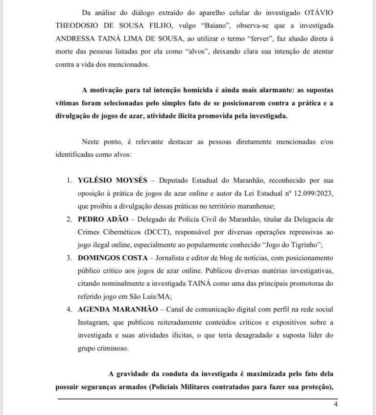 Trecho do relatório da Polícia Civil do Maranhão sobre a Operação Dinheiro Sujo revelou a hipótese de que a influenciadora Andressa Tainá Lima de Sousa, adepta da umbanda, possa ter tratado sobre um ritual para provocar a morte de autoridades e jornalistas, conforme gíria associada à feitiçaria em um documento divulgado pelo portal Marrapá nesse sábado, 9.