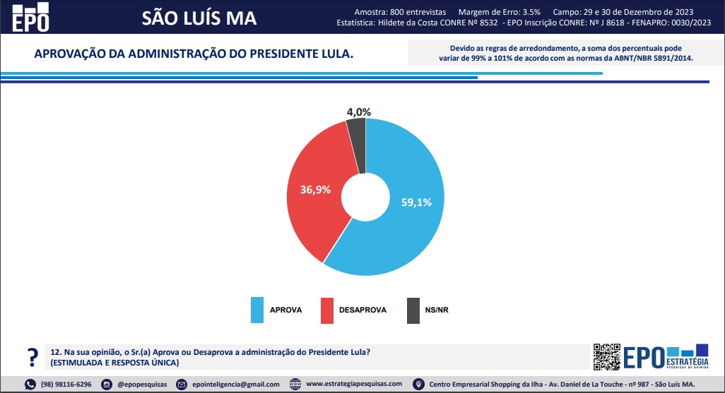 O levantamento indagou sobre a avaliação do Governo Lula: 59,1% respondeu que aprova, 36,9% que desaprova e 4,0% não soube ou não respondeu.