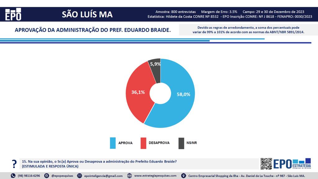 A pesquisa EPO quis saber a avaliação da administração do Prefeito Eduardo Braide (PSD). Neste cenário, 58,0% respondeu que aprova, 36,1% respondeu que não aprova e 5,9% não soube ou não respondeu.