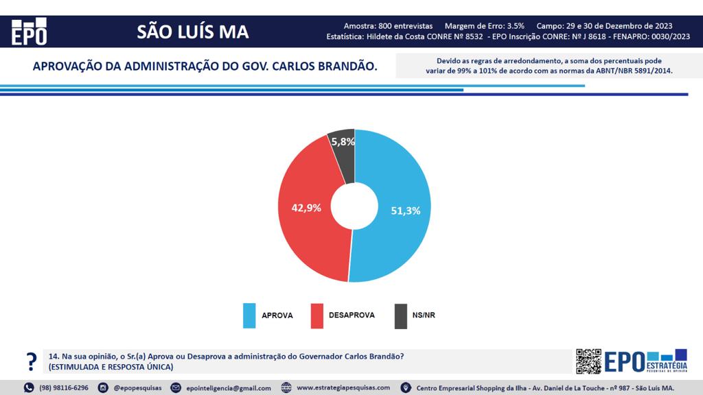 Perguntado se o eleitor aprova ou desaprova a gestão do governador Carlos Brandão (PSB), 51,3% respondeu que aprova, 42,9% respondeu que não aprova e 5,8% não soube ou não respondeu.