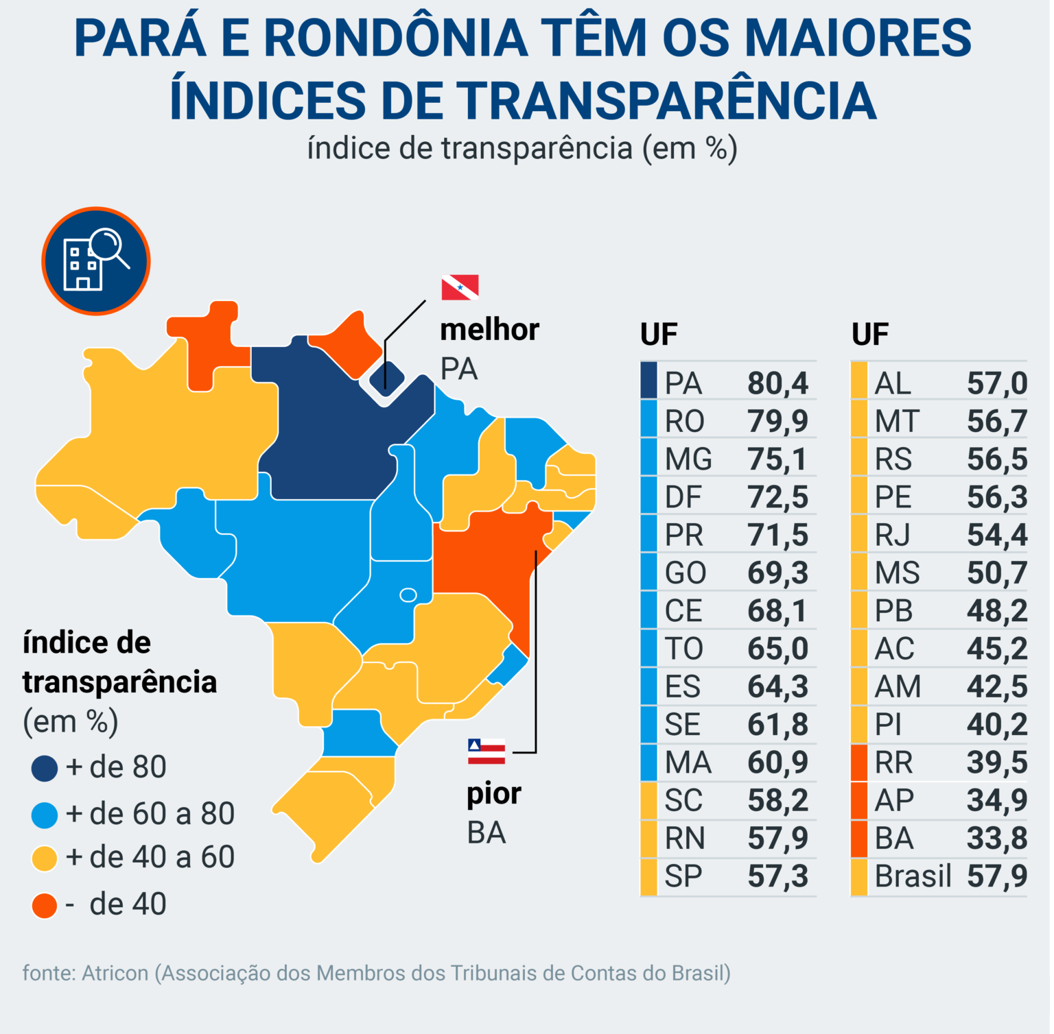 Por outro lado, Bahia (33,79%), Amapá (34,90%) e Roraima (39,50%) foram as mais mal avaliadas pela Atricon. Os estados demonstraram índices de transparência em portais públicos inferiores a 40%. A maioria das unidades da federação possui um índice geral de transparência variando de 40% a 60%.