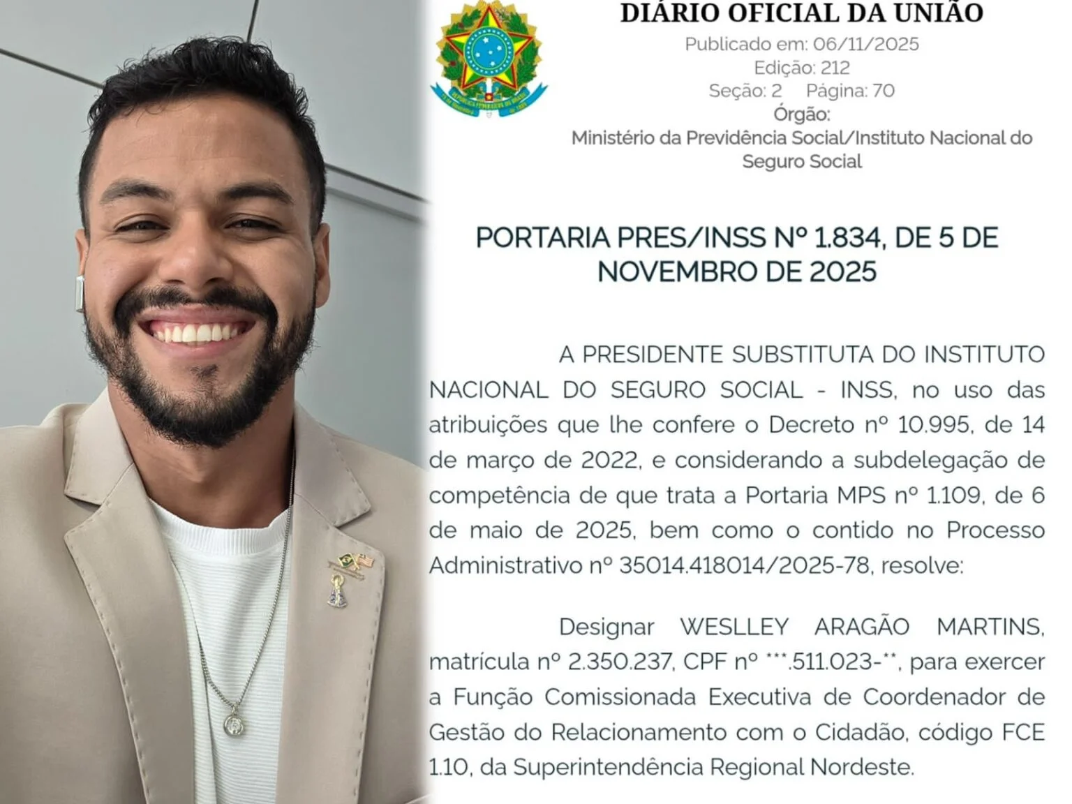 É a primeira vez que um servidor de carreira da autarquia no estado é convocado para ocupar um cargo tão crucial e essencial no INSS, responsável pelo atendimento direto aos segurados da Previdência Social, elaborando fluxos, procedimentos e rotinas institucionais.