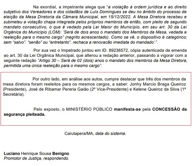 Em parecer publicado nesta terça-feira (14), o promotor de justiça Luciano Henrique Sousa Benigno, titular da Comarca de São Bernardo – respondendo por Carutapera, destacou que, em análise aos autos, apontou que três dos membros da mesa diretora foram reeleitos para os mesmos cargos, a saber: Jonhy Marcio Braga Queiroz (Presidente), José de Ribamar Pereira Gaião (2º Vice-Presidente) e Kelene Queiroz da Silva (1ªSecretária).
