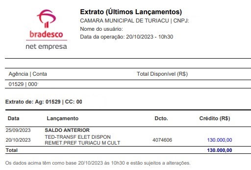 Em outubro, segundo extratos do Banco do Bradesco e dados do Portal da Transparência, foi repassado para a Câmara um total de R$ 130 mil, ou seja, a prefeitura ficou “devendo” ao Legislativo algo em torno de R$ 103.569,48, só referente ao mês atual.