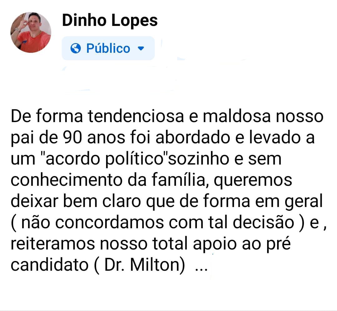 Também em postagem nas redes sociais, Dinho Lopes, que é outro filho do idoso, referendou a tese do irmão e reiterou o total apoio ao pré-candidato Doutor Milton. Segundo ele, o anúncio da aliança entre o pai e Luiza ocorreu de forma maldosa.