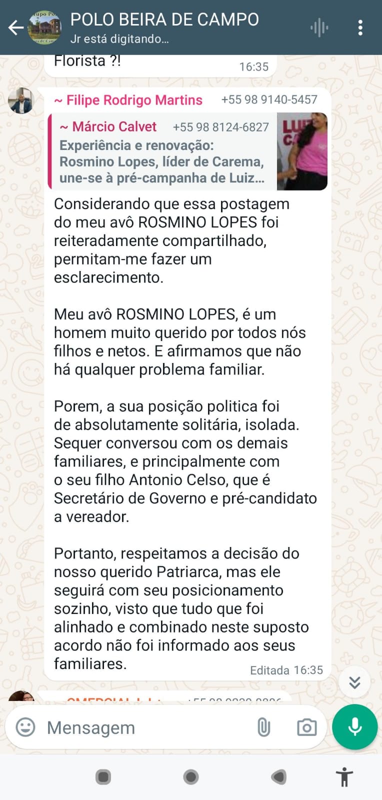 Felipe Rodrigo Martins, também se manifestou, por meio de grupos do whatsapp. Ele, que se identifica como neto do senhor Rosmino, lembrou que o avô é alguém muito querido no município e garantiu que não há qualquer problema familiar.