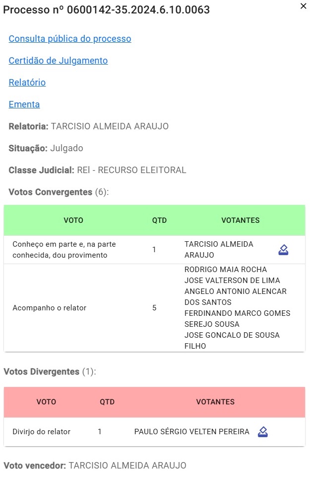 No julgamento virtual, iniciado nesta sexta-feira, 22, os julgadores Rodrigo Maia Rocha, José Valterson de Lima, Ângelo Antônio Alencar dos Santos, Ferdinando Marco Gomes Serejo Sousa e Jose Gonçalo de Sousa Filho seguiram o voto do relator, Tarcísio Almeida Araújo, e entenderam que não caracterizava a causa de inelegibilidade do art. 1º, inciso I, alínea “l”, da LC nº 64/1990 quanto à decisão judicial constante no processo de improbidade, cuja sentença transitou em julgado em 14/09/2021.