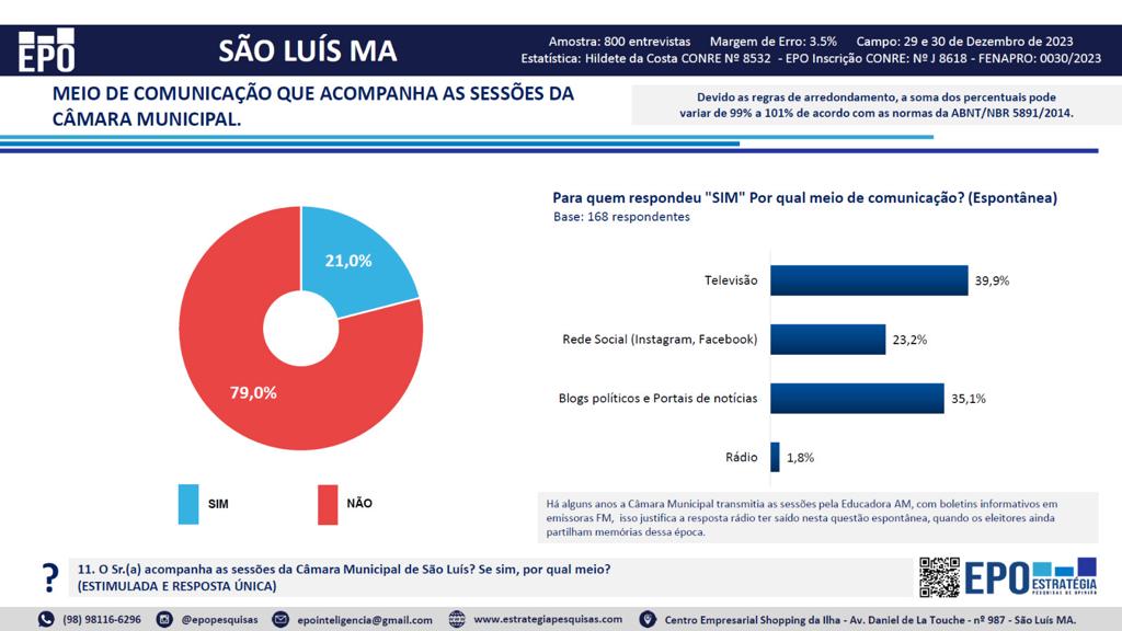 SÃO LUÍS, 31 de dezembro de 2023 – A televisão e os blogs e sites são os veículos mais utilizados pelos ludovicenses para se informar sobre a política e acompanhar as sessões da Câmara Municipal de São Luís, conforme revelou a mais recente pesquisa do instituto EPO, realizada entre os dias 29 e 30 de dezembro.
