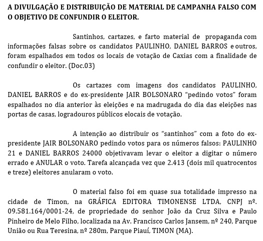 “A intenção ao distribuir os “santinhos” com a foto do ex-presidente Jair Bolsonaro pedindo votos para os números falsos: Paulinho 21 e Daniel Barros 24000 objetivavam levar o eleitor a digitar o número errado e anular o voto. Tarefa alcançada vez que 2.413 (dois mil quatrocentos e treze) eleitores anularam o voto”, completou outro trecho do documento.