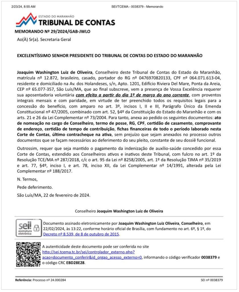 SÃO LUÍS, 27 de fevereiro de 2024 – Ao solicitar a antecipação de sua aposentadoria do Tribunal de Contas do Estado do Maranhão (TCE-MA), o conselheiro Joaquim Washington Luiz de Oliveira, requereu em ofício encaminhado ao presidente da Corte de Contas, conselheiro Marcelo Tavares, pedido para manter o auxílio-saúde.