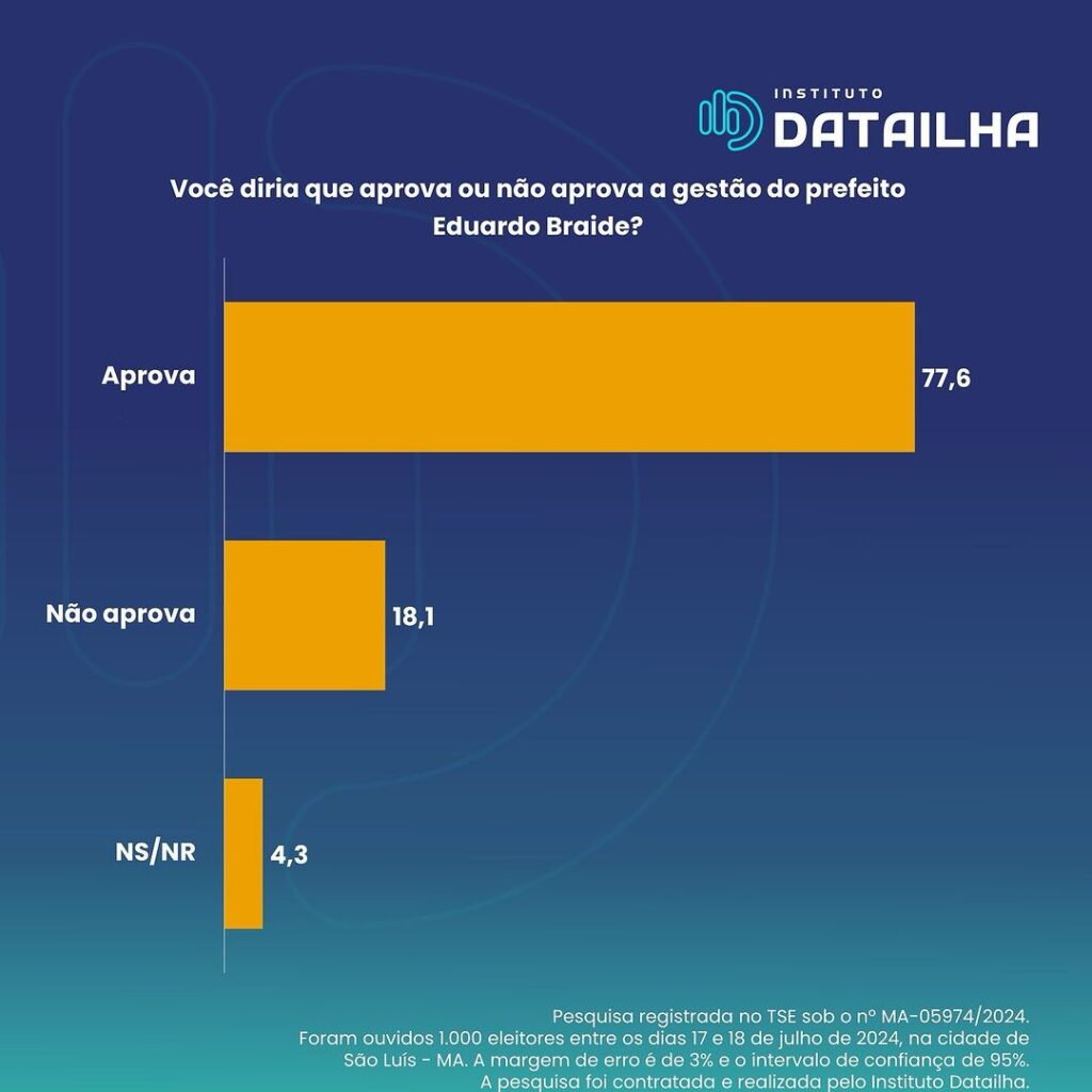 O Instituto Datailha ouviu 1.000 eleitores entre os dias 17 e 18 de julho de 2024. A margem de erro é de 3% e o intervalo de confiança é de 95%.A pesquisa está registrada no Tribunal Superior Eleitoral (TSE) sob o protocolo MA-05974/2024.