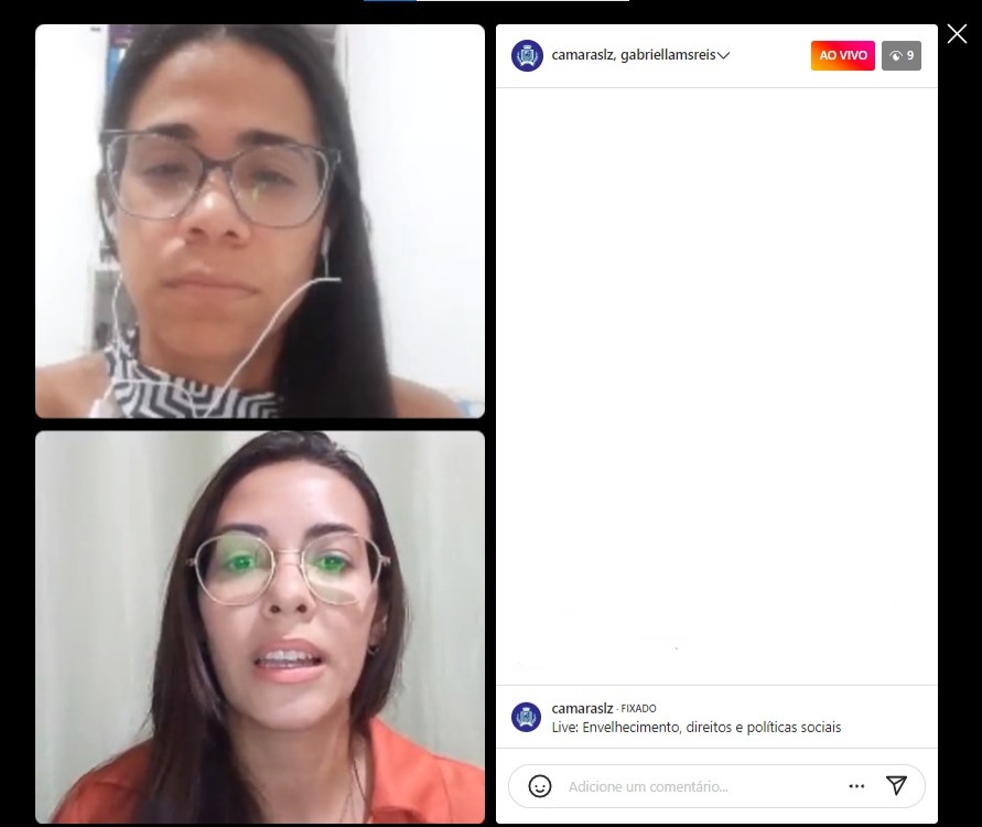A Câmara de São Luís promoveu na noite da última quinta-feira, 06, uma live com o tema “Envelhecimento, direitos e políticas públicas”, que ouviu a assistente social Gabriela Reis, especialista em Administração, Avaliação e Planejamento de Programas e Projetos Sociais, com mediação de Karoline Rocha, assistente social da Casa Legislativa.