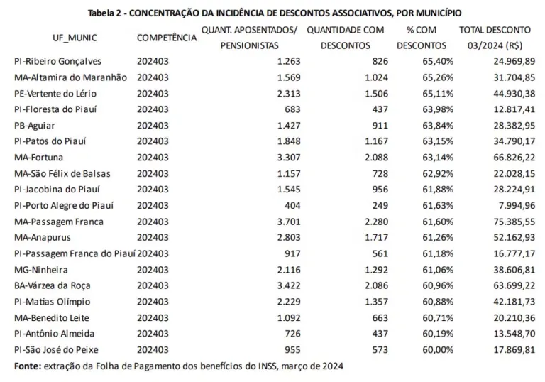 A CGU identificou, com base nos dados de março de 2024, “19 municípios com 60% ou mais de aposentados/pensionistas que possuem descontos de mensalidades associativas implementados, localizados principalmente no interior de estados nordestinos, com predominância do Maranhão e Piauí”.