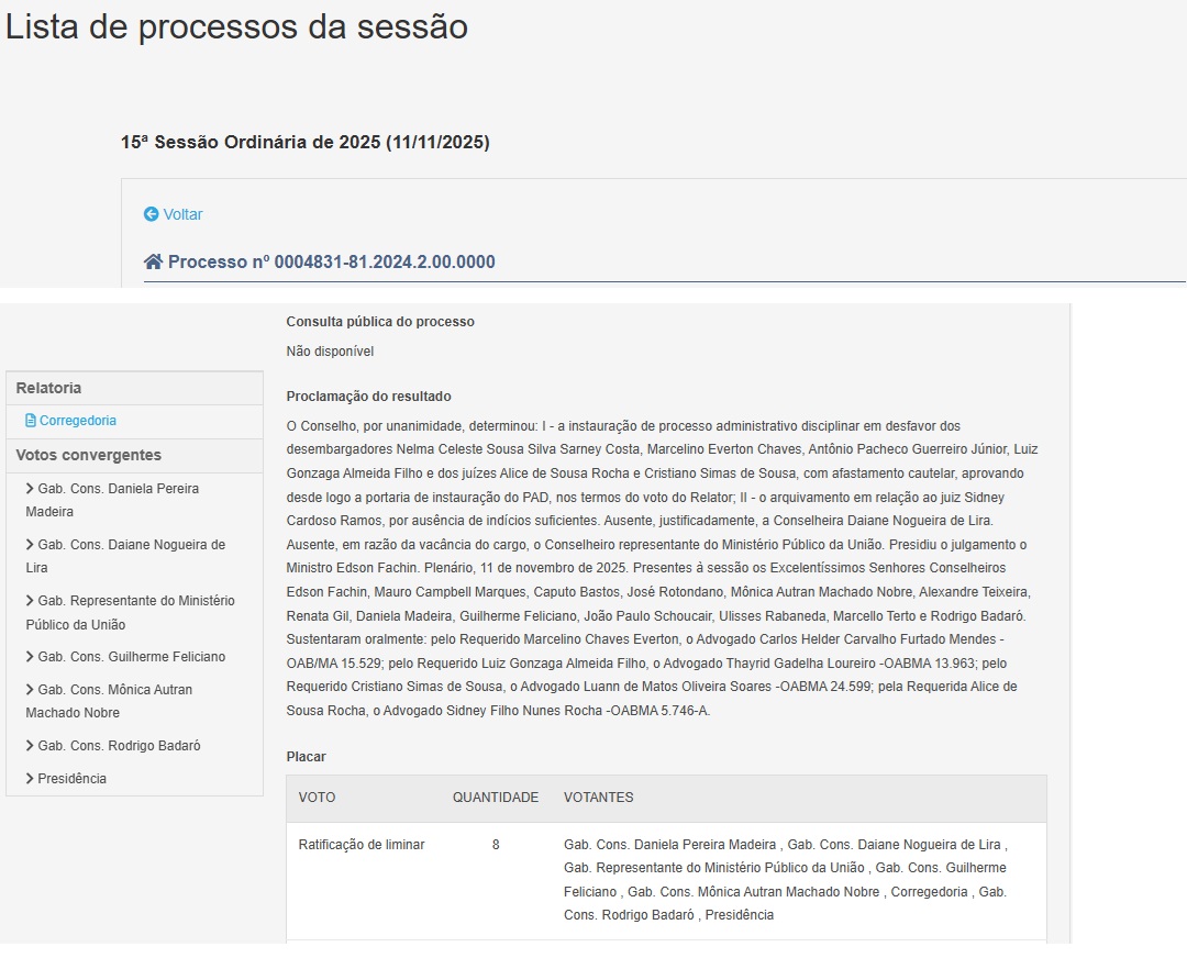 O Pedido de Providências nº 0004831-81.2024.2.00.0000, foi relatado pelo corregedor nacional de justiça, ministro Mauro Campbell Marques, foi julgado procedente, com manutenção cautelar do afastamento até decisão final. O julgamento ocorreu sob a presidência do ministro Edson Fachin.