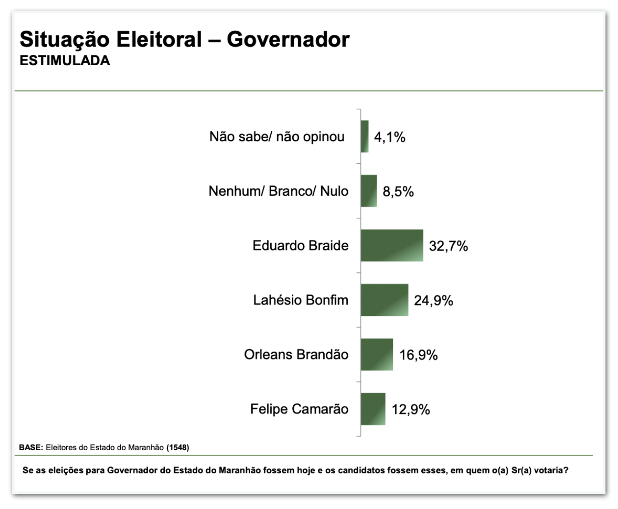 A pesquisa, uma das mais tradicionais do país – está na 2ª rodada no Maranhão –, mostra Braide com 33,7% das intenções de voto contra 20,9%, de Orleans. Em fevereiro deste ano, o prefeito tinha 32,7% contra 16,9% do secretário – a diferença de quase dezesseis pontos caiu para pouco mais de doze no período. A margem de erro é de 2,5 pontos percentuais para mais ou para menos.