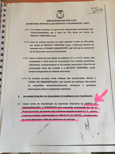 A revelação sobre o aumento da passagem de ônibus consta no item que trata do ‘equilíbrio econômico’ e diz que como forma de manutenção da ‘expressão financeira da tarifa de remuneração’, o contrato será reajustado anualmente por ato do Poder Executivo. Como foi assinado em julho deste ano, significa dizer que o próximo reajuste será em julho do ano que vem, conforme documento em anexo.