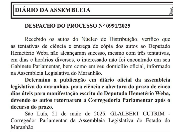 Após três tentativas de notificar, sem êxito, o deputado Hemetério Weba (PP) com relação a uma decisão judicial que determinou a suspensão de seus direitos políticos, resultando na cassação de seu mandato, a Assembleia Legislativa do Maranhão citou Weba por edital, conforme prevê o regimento interno da Casa, e determinou a abertura do prazo de cinco dias úteis para manifestação escrita do parlamentar, devendo os autos retornarem à Corregedoria Parlamentar após o decurso do prazo.
