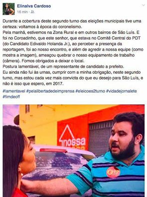 Também pela manhã, a jornalista Elinalva Cardoso, ultilizou seu perfil no Facebook, para denunciar que foi agredida, na zona rural de São Luís, por um militante que apoia a candidatura à reeleição de Edivaldo Júnior.