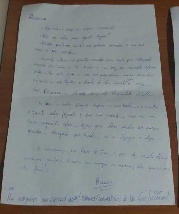 “Foi boa a carta porque expôs a verdade. E mostra o quanto sofri fazendo o que era errado […] espero que Deus perdoe os meus pecados”, disse Mariano de Castro.