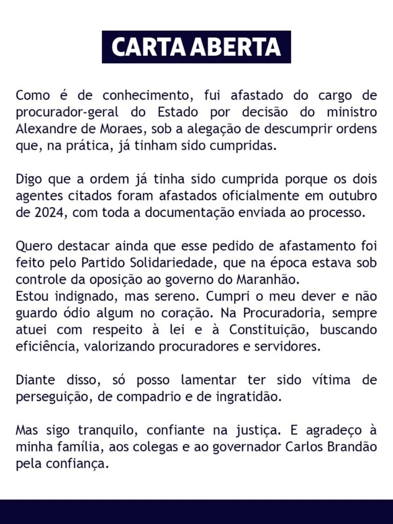 Ele declarou também que considera sua saída uma consequência de perseguição, compadrio e ingratidão. Apesar disso, afirmou manter a confiança na Justiça e agradeceu à família, aos colegas de trabalho e ao governador Carlos Brandão pelo apoio recebido.
