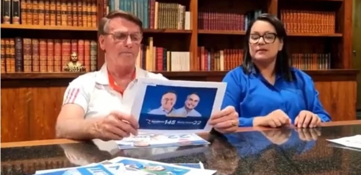 Ao citar o Maranhão, ele pegou um folheto em que há uma foto dele e do candidato à reeleição ao Senado no estado, senador Roberto Rocha (PTB) e apresenta o panorama ao ler informações no verso da folha.