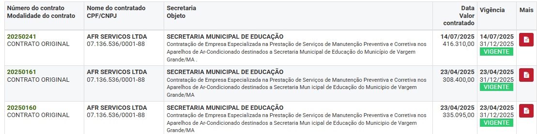 Quase R$ 400 mil. Este é valor pago em menos de um mês pela prefeitura de Vargem Grande pela manutenção dos sistemas de ar-condicionado das escolas da rede municipal. Segundo o blog do Isaias Rocha apurou, a empresa AFR Serviços Ltda, é a responsável por prestar o atendimento ao município.