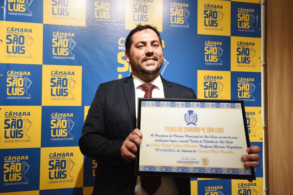 Bastante emocionado, Rafael Velasco elogiou o vereador Chico Carvalho e agradeceu a Câmara pela homenagem. “Recebo esse título de forma bastante honrosa. A minha história em São Luís é construída com a história de cada uma dessas pessoas que vieram prestigiar essa solenidade”, disse. “Esse é um momento de profunda emoção para mim, pois a capital maranhense não é só um lugar onde eu escolhi viver, pois foi nesta cidade que eu escolhi fazer daqui o meu lar. Digo a vocês que São Luís não é simplesmente um lugar no mapa. É um lugar que está hoje em meu coração”, completou.