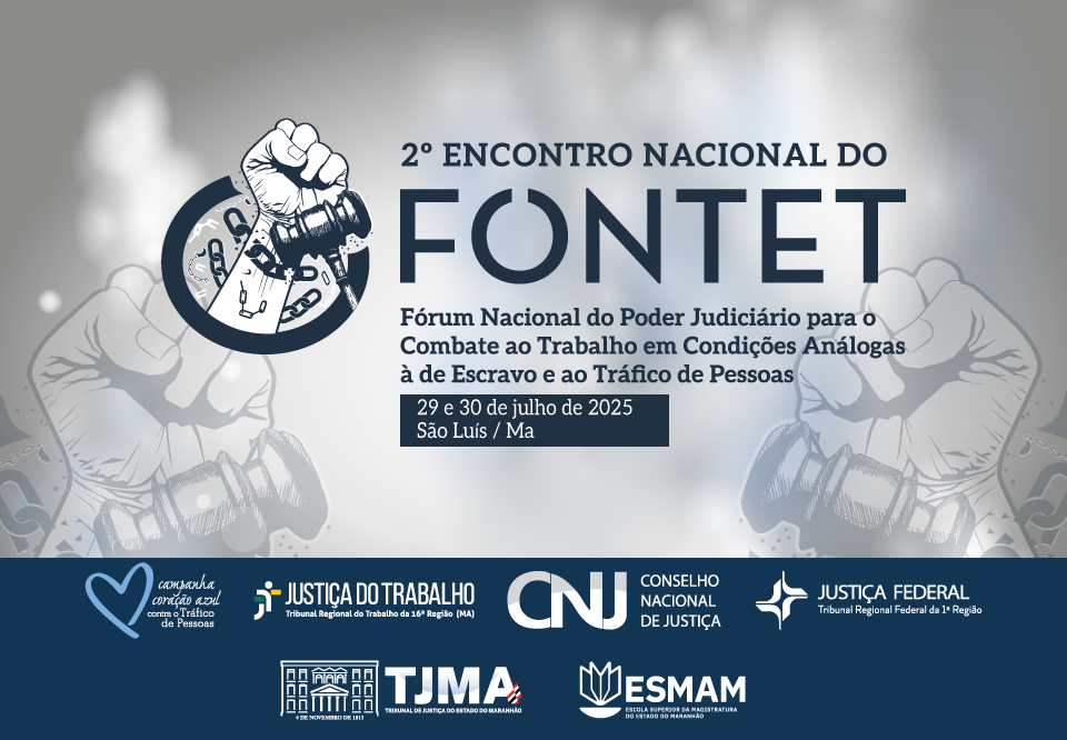 Nos dias 29 e 30 de julho, a capital maranhense receberá o 2º Encontro Nacional do Fórum Nacional do Poder Judiciário para Monitoramento e Efetividade das Demandas Relacionadas à Exploração do Trabalho em Condições Análogas à de Escravo e ao Tráfico de Pessoas (Fontet). O evento será realizado na Universidade Ceuma, no bairro Renascença (Rua Anapurus, nº 1), em São Luís.