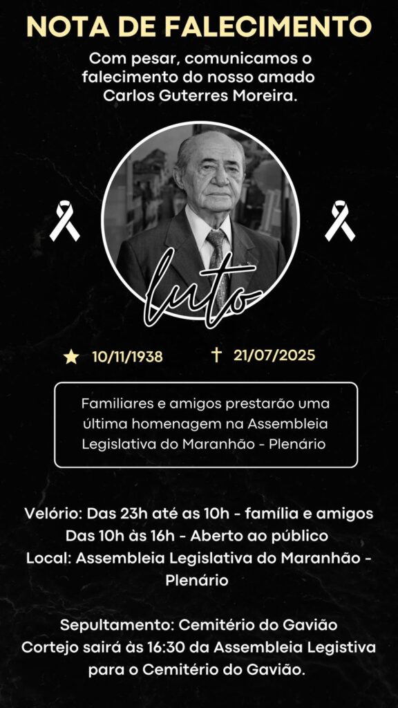 O velório ocorrerá até amanhã, as 10h, no plenário da Assembleia Legislativa do Maranhão. O sepultamento ocorrerá no Cemitério do Gavião, com cortejo saindo da Casa às 16h30.