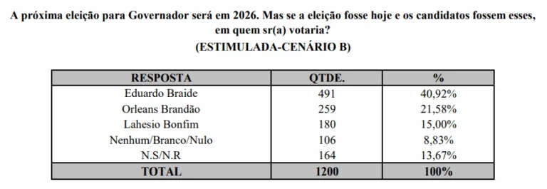 O levantamento ouviu 1.200 eleitores presencialmente, em 39 municípios, entre os dias 4 e 8 de agosto de 2025. A margem de erro é de 3,28% e nível de confiança de 95%.