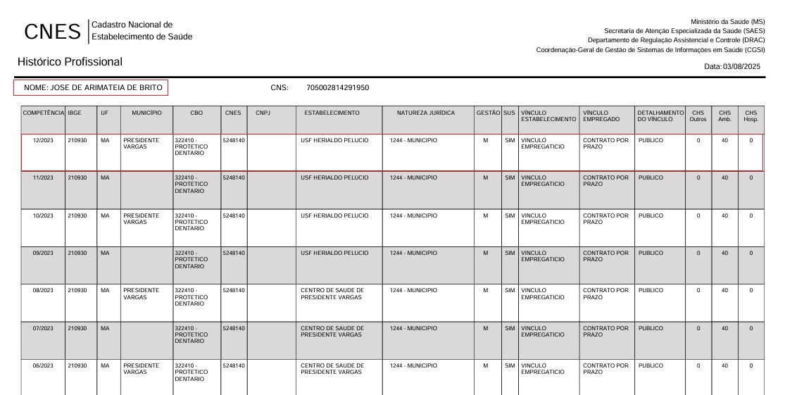 De acordo com informações do Cadastro Nacional de Estabelecimentos de Saúde (CNES), o último registro profissional dele na cidade foi na UBS Herialdo Pelucio, em 2023. O vínculo empregatício era estabelecido por meio de contrato por prazo determinado, com uma carga horária de 40 horas semanais. Eis a íntegra do histórico – (20 KB).