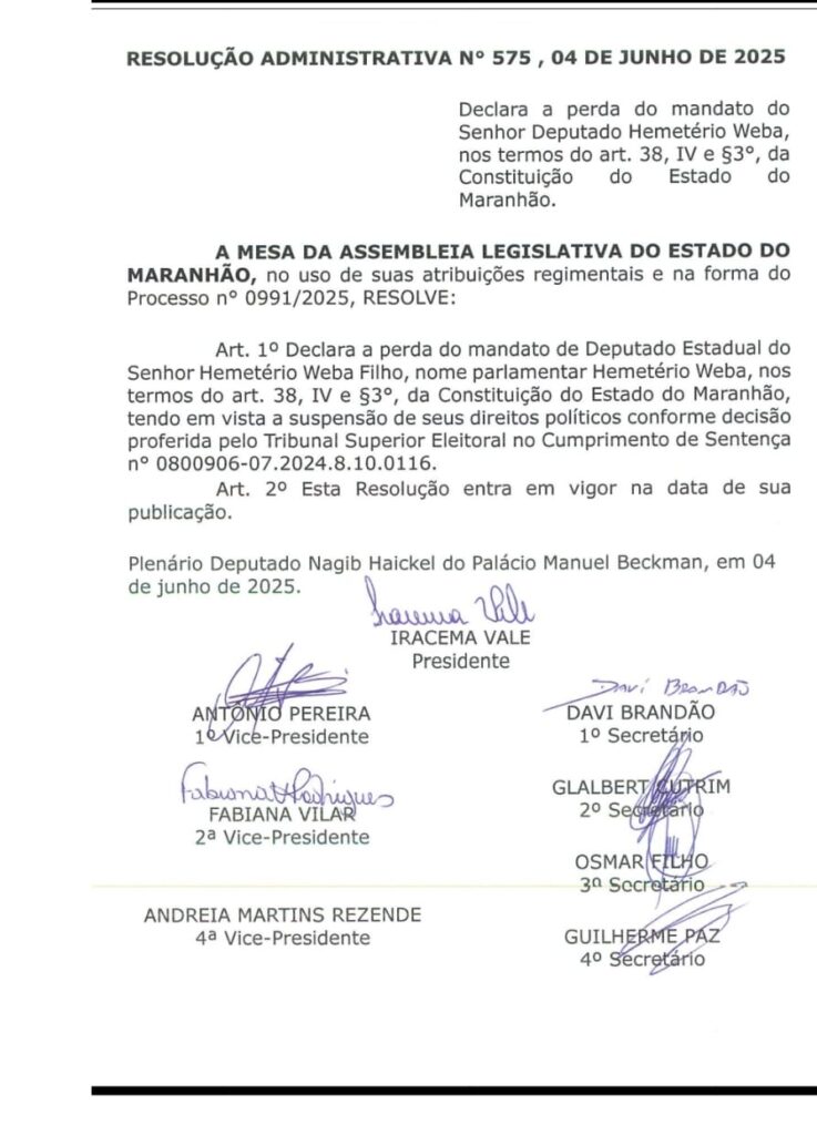 A cadeira de Weba foi declarada vaga pela Mesa Diretora na última quarta-feira, 4, e o ato foi publicado no Diário Oficial da Casa na sexta, 6.
