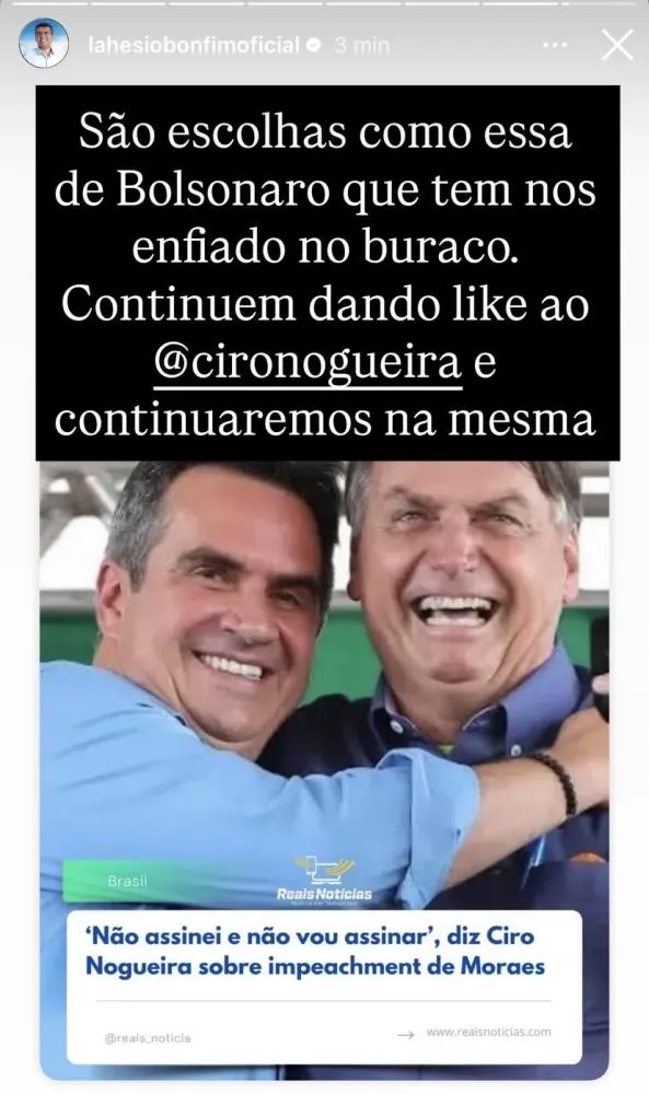 “São escolhas como essa de Bolsonaro que têm nos enfiado no buraco. Continuem dando like ao Ciro Nogueira e continuaremos na mesma”, escreveu Lahesio, ao comentar uma notícia sobre a recusa de Ciro em apoiar o impeachment do ministro Alexandre de Moraes, do STF.