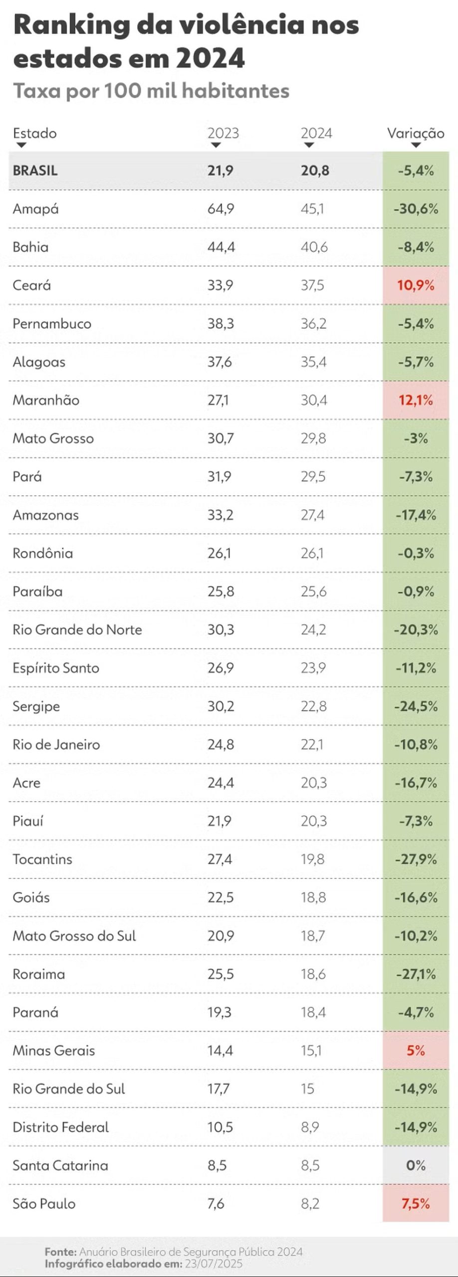 Além do Maranhão, apenas outros três estados registraram piora no índice: Ceará (que passou do 5º para o 3º lugar), Minas Gerais (24º para 23º) e São Paulo (que manteve a 27ª posição, a menos violenta do país, mas com piora nos indicadores).