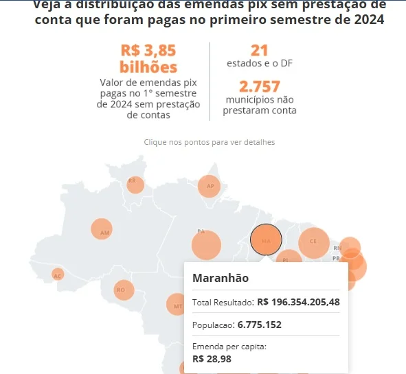 Apenas 14% dos recursos repassados por essa modalidade têm uso detalhado divulgado, segundo levantamento da Transparência Brasil obtido pelo jornal O GLOBO. O Maranhão, por exemplo, não prestou contas de quase R$ 200 milhões.