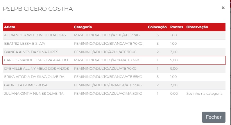 Além disso, Manoel também tem uma boa classificação no desempenho por equipe, alcançando nota 9 e colocando a equipe de Cícero Costha PSLPB na sexta colocação entre as 20 que participaram do torneio.