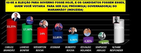 O prefeito de São Pedro dos Crentes, Lahesio Bomfim (PSC) surge com 12,15% e o senador Weverton Rocha (PDT) com 10,60%, o deputado Josimar (PL), com 9,70%; o senador Roberto Rocha (PTB), com 4,10%, seguido pelo ex-prefeito de São Luís, Edivaldo Júnior (PSD), com 2,30% e o ex-secretário Simplicio Araújo (SD), com 0,10%. Não sabem ou não responderam marcou 45,85%.